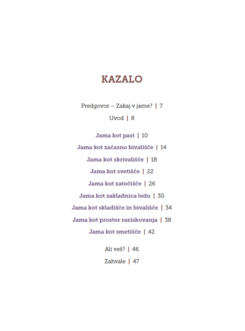 V knjigi je devet poglavij, ki predstavljajo sobivanje človeka in jame od prazgodovine naprej - jama kot zatočišče, jama kot smetišče, jama kot skladišče ... V vsakem poglavju je predstavljena posamezna funkcija jame, ob njej pa še ena od zanimivosti, povezanih z njo. Za povezavo z realnimi primeri smo vsakemu poglavju dodali še »osebno izkaznico« predmeta oziroma najdbe iz določene jame in »osebno izkaznico« same jame. Dodatni "fun facti" so predstavljeni v obliki zapisov "Ali veš."