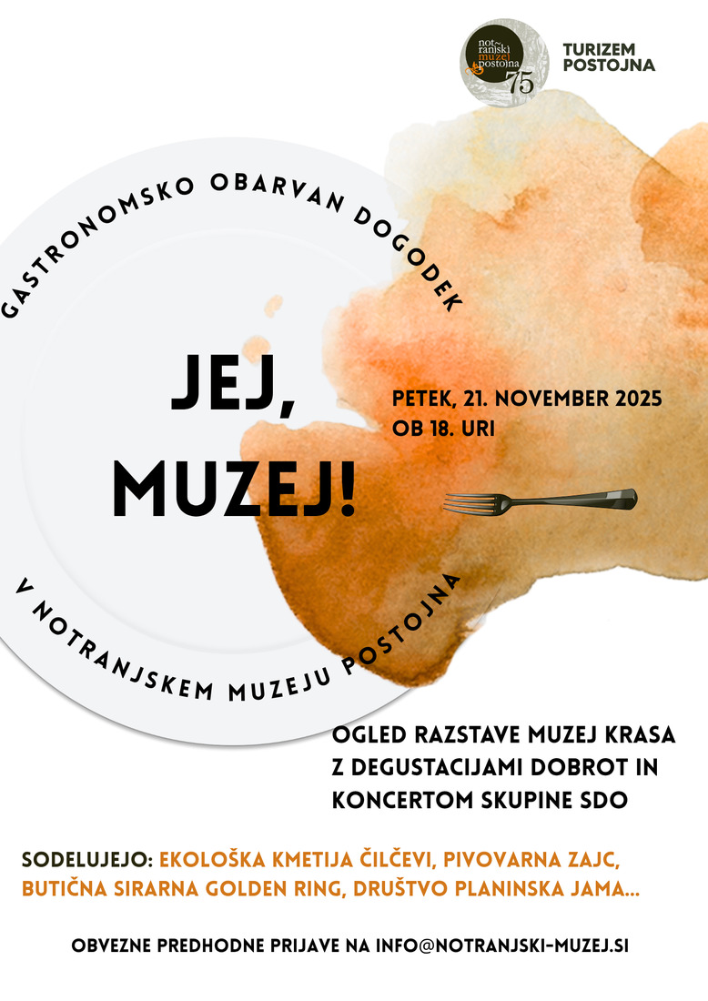 Drugič zapored, tokrat v sodelovanju s Turizmom Postojna, vas vabimo na dogodek Jej, muzej!, na katerem naše muzejske zgodbe dobijo kulinarično preobleko. Letos bo dogodek potekal tudi v prenovljenih prostorih razstave, v katerih pripravljamo posebno izkušnjo, ki povezuje dediščino, kulinariko in lokalne ustvarjalce.