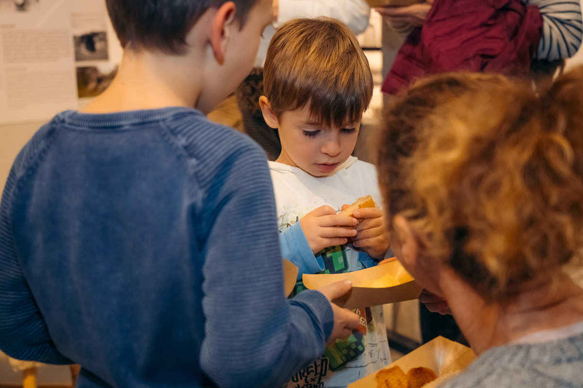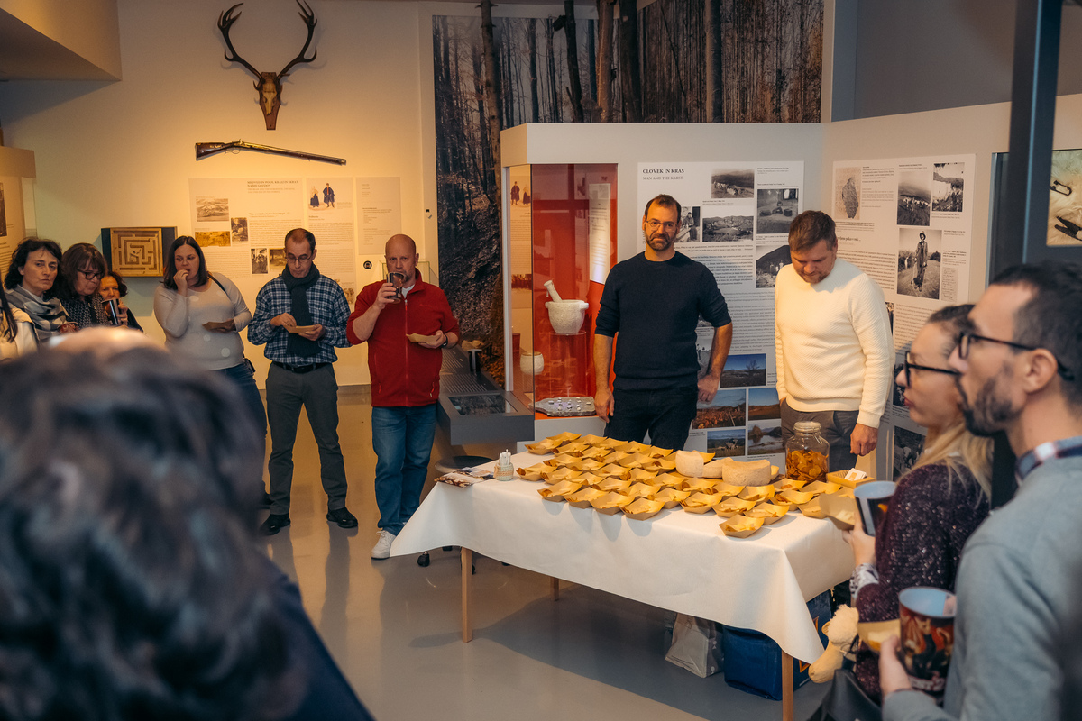 Po razstavi so v manjših skupinah potekale krožne vodene degustacije, med katerimi so gostje na različnih točkah okušali izbrane lokalne dobrote, kustosi pa smo jim predstavili povezavo med kulinaričnimi dobrotami in vsebinami razstave. Vsaka postojanka je nosila svojo zgodbo, vsak ponudnik pa delček kraške identitete, ki so jo obiskovalci lahko doživeli z vsemi čuti.