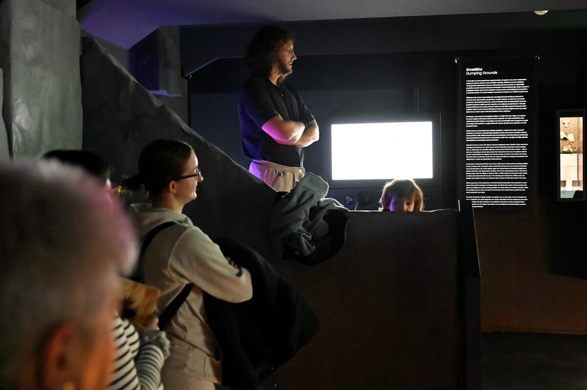 Dr. Kaluža je najprej predstavil nastanek knjige ter osvetlil je široko mrežo sodelavcev – od raziskovalcev do jamarjev –, brez katerih knjiga ne bi mogla nastati. Spregovoril je tudi o izzivih pri zbiranju gradiva ter poudaril, da je knjiga namenjena najširši javnosti, od radovednih otrok do strokovne publike. Poudaril je, da se vsebina knjige Jame navezuje na stalno razstavo Notranjskega muzeja, poimenovano Muzej krasa in je z namenom predstavitve te povezave (razstava - knjiga) obiskovalce po koncu pogovora popeljal še delu novih razstavnih prostorov.