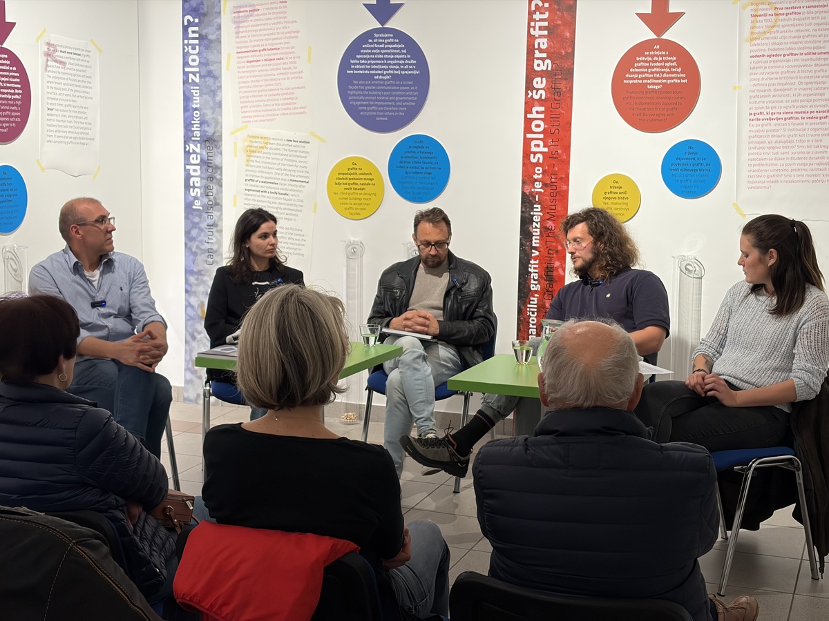 V sredo, 15. aprila 2026, smo v Notranjskem muzeju Postojna organizirali okroglo mizo na temo grafitov, ki jih obravnava začasna razstava z naslovom Zločin in sadež. Slednja predstavlja grafite in njihovo večplastnost prek vsebinskih sklopov, med katerimi lahko najdemo na primer fenomen jamskih grafitov in vojaških poslikav, ki so posebnost Postojnskega. V pogovoru, ki ga je moderirala Ana Čič so sodelovali: